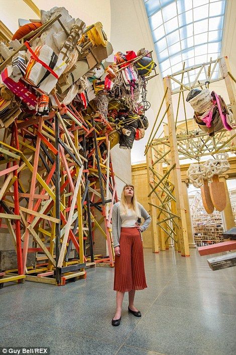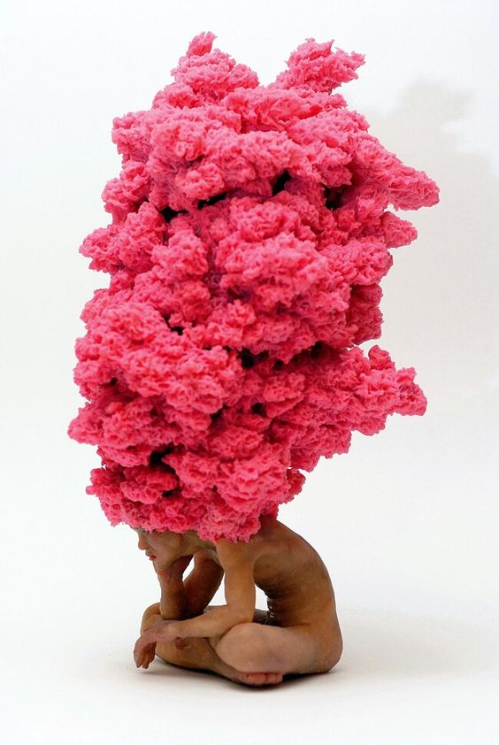 I want to work with polyeurethane foam and I found this artist. The hat even though in concrete and the person is a sculpture reminded me of my material Expanding foam and it is roughly the height I would like to achieve, and integrate materials to this piece. It makes me think about a dream, how someone has her/his head on the clouds and It intrigued me because I realised that this effect was only rendered by the colour pink and the texture, If I however paint it white and integrate materials the idea will be totally different.
