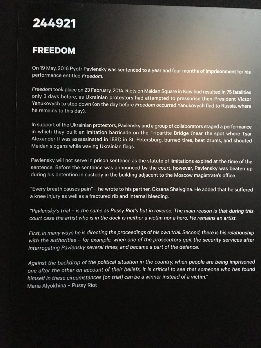 I went to see this exhibition at the saatchi gallery and I was astonished to see how far people believe in their idea and how far they were willing to go to defend it. Piotr Pavlensky, is one of those artist who put himself in barbed wire, or sew his lips to show how there was no liberty of expression. The activists, and feminists also showed me that from repression creativity emerges. I'd like to engage people in my work like these artists does, and wish to make them react. Art has this role today. This inspires me for my work, I will try through performance to raise awareness and questions about my work.