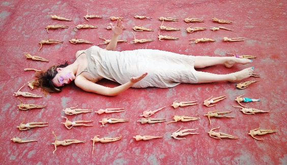 I like the way the artist is laying in the middle of all these barbies on the floor. It inspired me as similarly, i'm making a performance where people will have to weigh 49.5 kg in order to lay on the bed. I think that once everyone has tried my performance, weighed themselves and failed to be the actual weight i will put a barbie , or a mannequin and make the bed stand as to show our society icon or idole, a plastic model. A bit like when we expose these victoria secret model on a catwalk, and everyone's worship their body, almost with a label saying ' This is what you should look like'