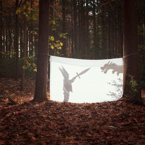 I like how the artist played with the shadows, I expect my curtain to look quite similar as it will also be hang in between two trees. I am hesitant, as I know I would like to play with the idea of the wall dividing people from their own happiness and was especially interested by the idea that the people would see their happiness on the other side however could not reach it as a 'wall was standing in between'. This picture is then quite relevant to this idea, you can see something going on behind the curtain but you cannot reach it. I could use this idea and shine light behind my curtain, and playing with the shadows overnight.